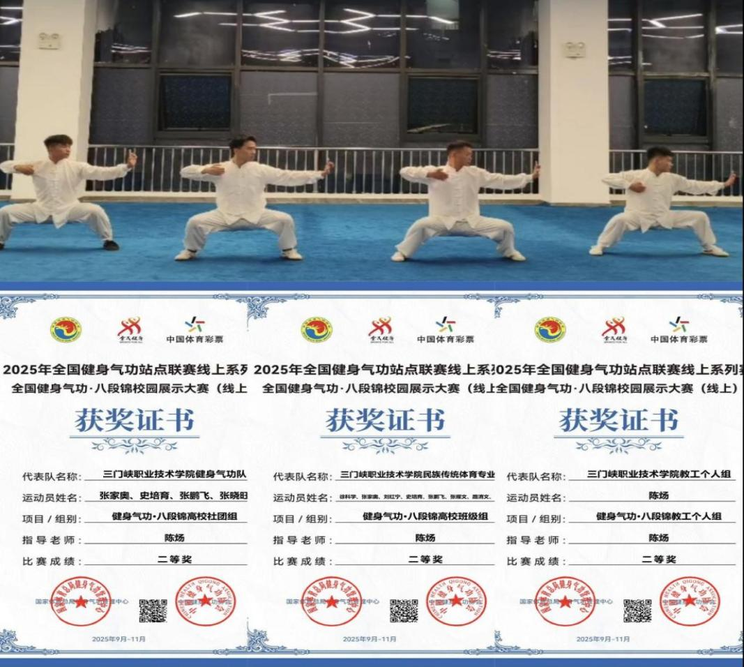 2025年,在国家体育总局健身气功管理中心主办的“全国健身气功·八段锦校园展示大赛(线上)”中,我院选派的两支学生队伍与一支教师队伍凭借规范的动作展示与出色的整体表现,均荣获大赛二等奖。此次线上赛事吸引了全国百余所院校参与,获奖充分展现了我院在民族传统体育教学与训练方面的扎实成效。