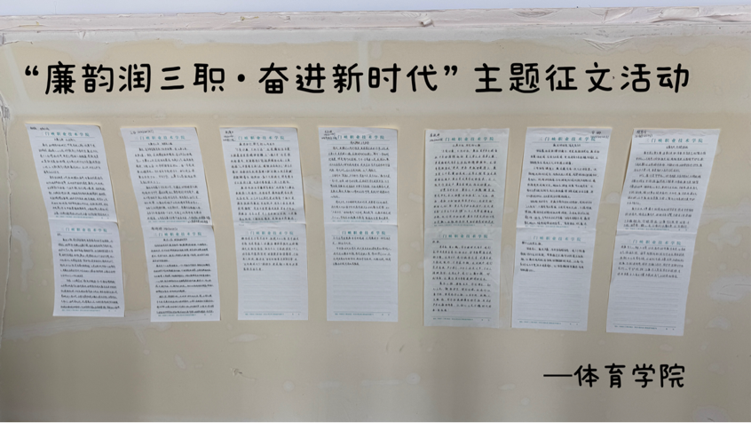 活动期间,学院墙面集中展示了多篇主题征文。征文内容涵盖教育初心、师德师风、青春理想等多个维度。整洁排列的文稿以“廉韵润三职·奋进新时代”为总领,内容紧扣廉洁修身、立德树人的核心,结合体育专业特色与自身感悟创作征文。体育人在赛场上的公平竞争、对规则的坚守,成为他们诠释廉洁的生动素材。