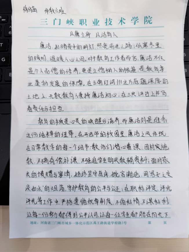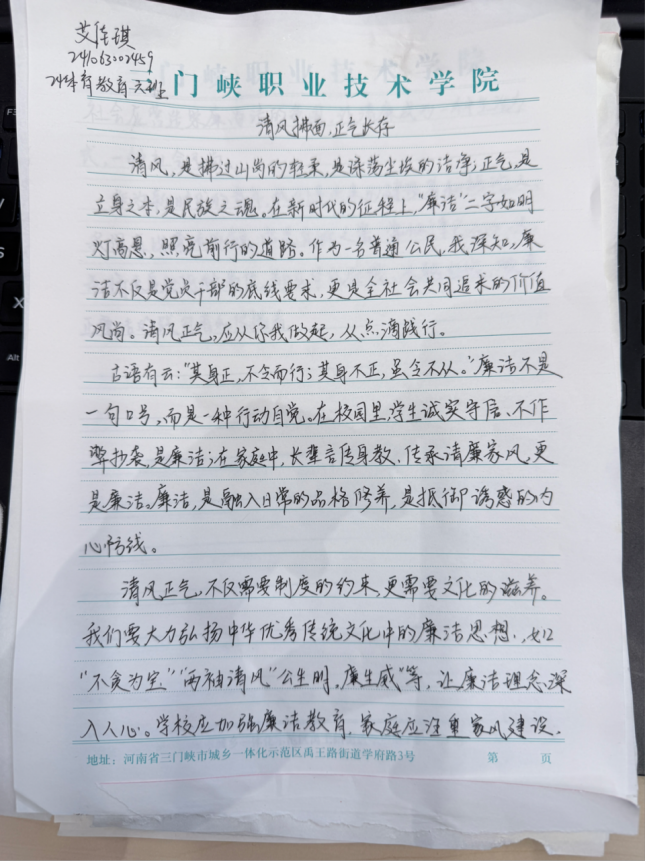 体育学院徐华菡同学在《从廉立身 以洁育人》中写道:“廉洁是教育事业蓬勃发展的保障,教师应以‘君子之交淡如水’的坦荡守护教育公平”;艾佳琪同学在《清风拂面,正气长存》中强调:“廉洁需知行合一,从校园诚信、家风传承到社会风尚,皆需清风涤荡。”这些文章结合教育实践与个人感悟,展现了青年学子对廉洁文化的深刻理解。